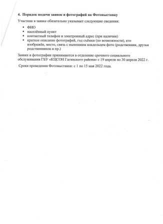 ГБУ «КЦСОН Гагинского района» проводит фотовыставку «В память о войне» в рамках реализации мероприятий к 77- летней годовщины Победы в Великой Отечественной Войне. К участию в фотовыставке принимаются фотографии из семейных архивов граждан сделанные в период Великой Отечественной Войны и в первые послевоенные годы. Сбор фотоматериалов для фотовыставки принимает отделение срочного социального обслуживания ГБУ «КЦСОН Гагинского района» с 19 апреля по 30 апреля. Проведение фотовыставки с 1 мая по 15 мая 2022 года в фойе здания ГБУ «КЦСОН Гагинского района».