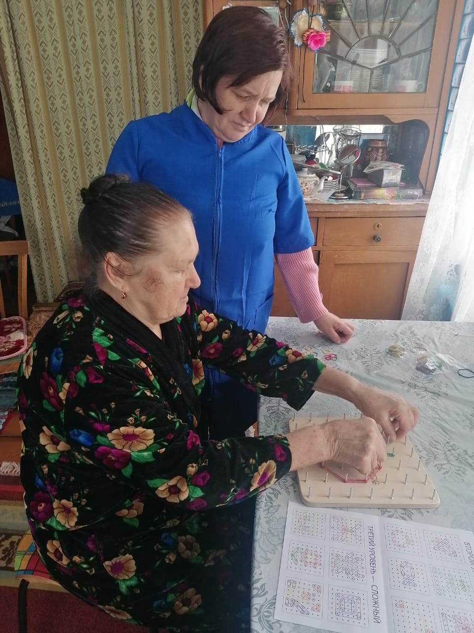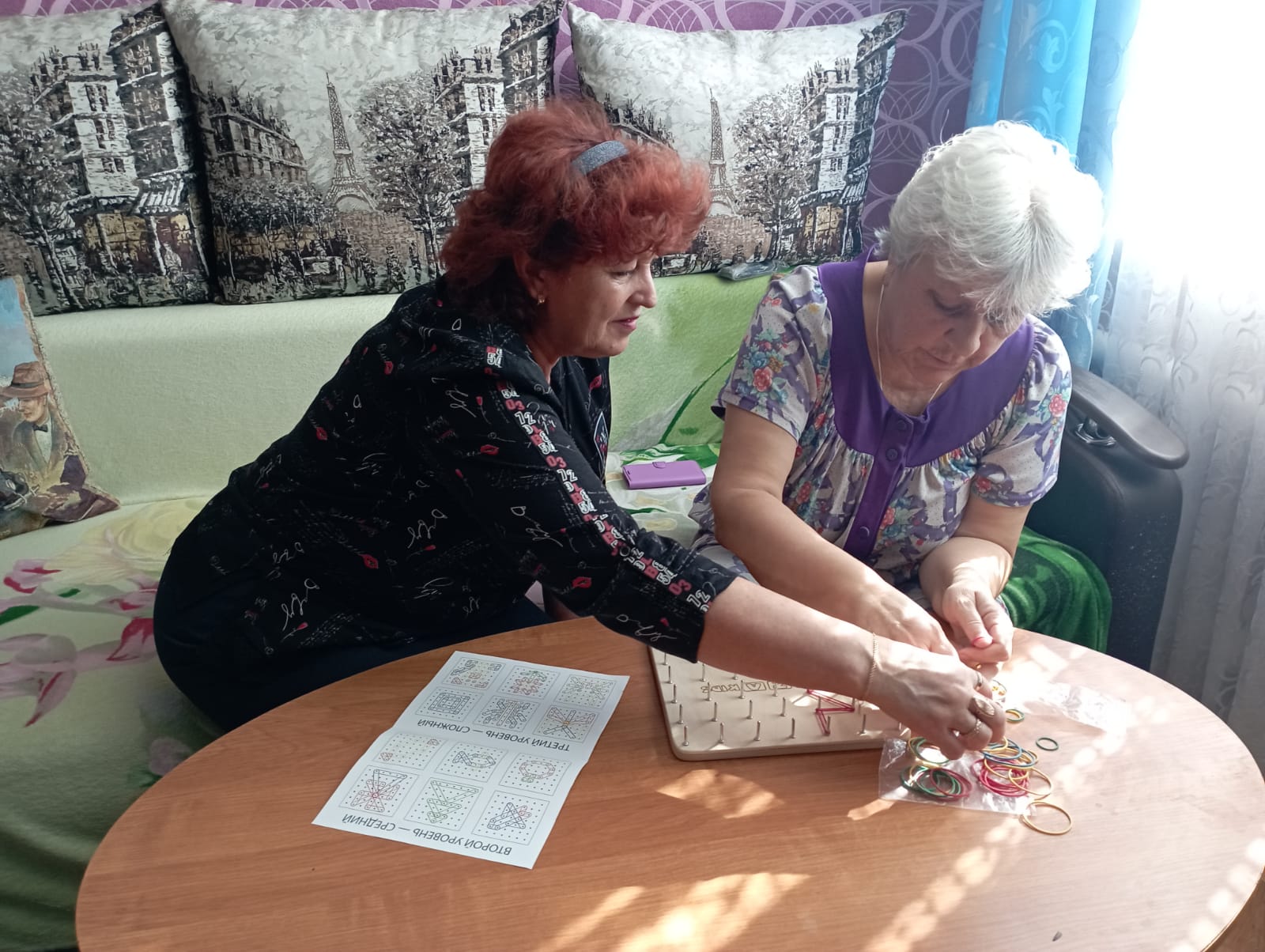 Получатели социальных услуг в отделении социально-бытового обслуживания в рамках инновационной программы «ИГРАТЕРАПИЯ» на занятии с заведующим отделением осваивали новую настольную игру - геоборд. Манипуляция различными предметами, а в данном случае при помощи обычных резинок и линий можно изобразить окружающую действительность: цветы, деревья, радугу или просто рамку для фотографий. И если упражняться в таком виде игры, то через непродолжительное время будут заметны изменения в лучшую сторону, облегчится выполнение повседневных дел и снизится рассеянность.